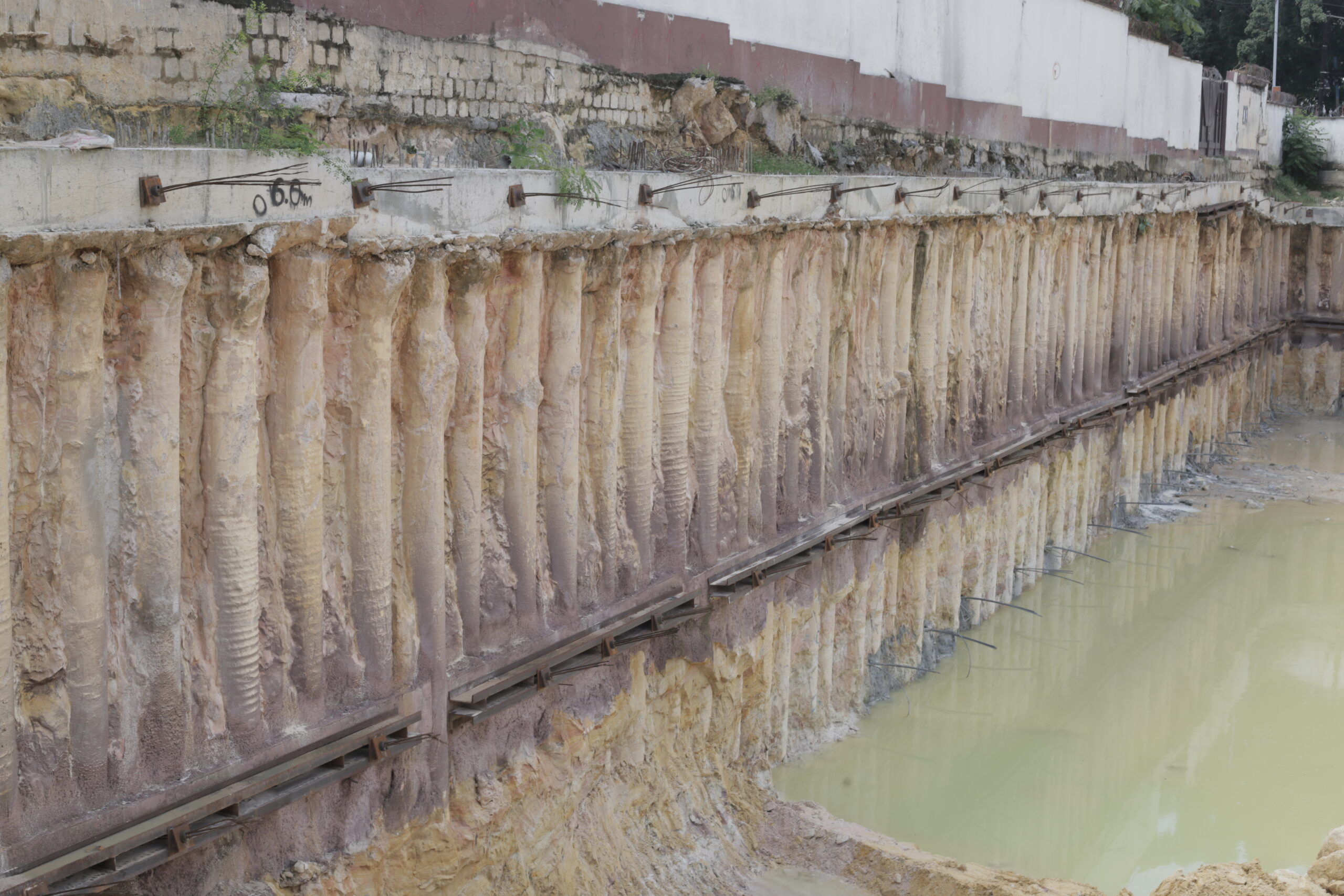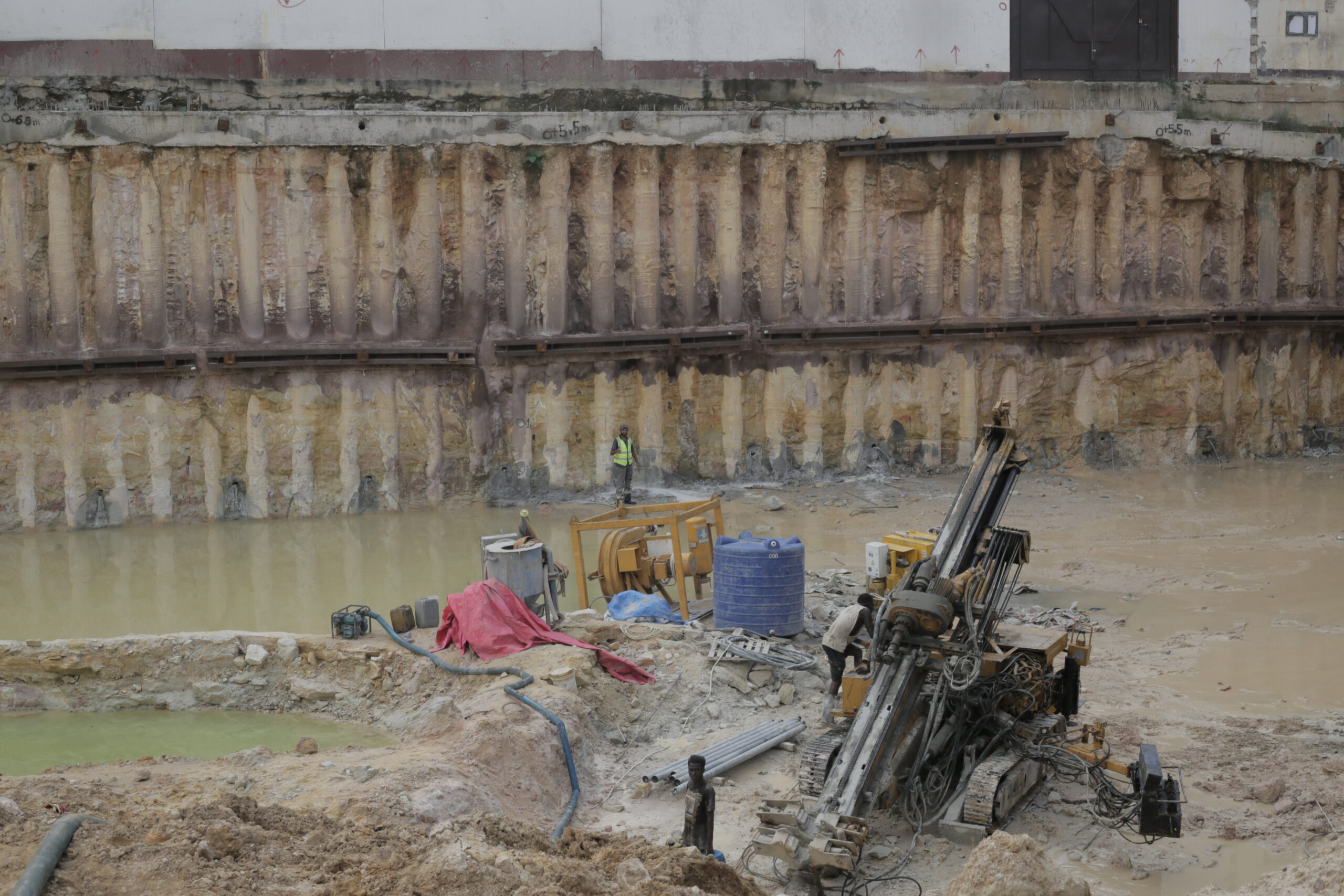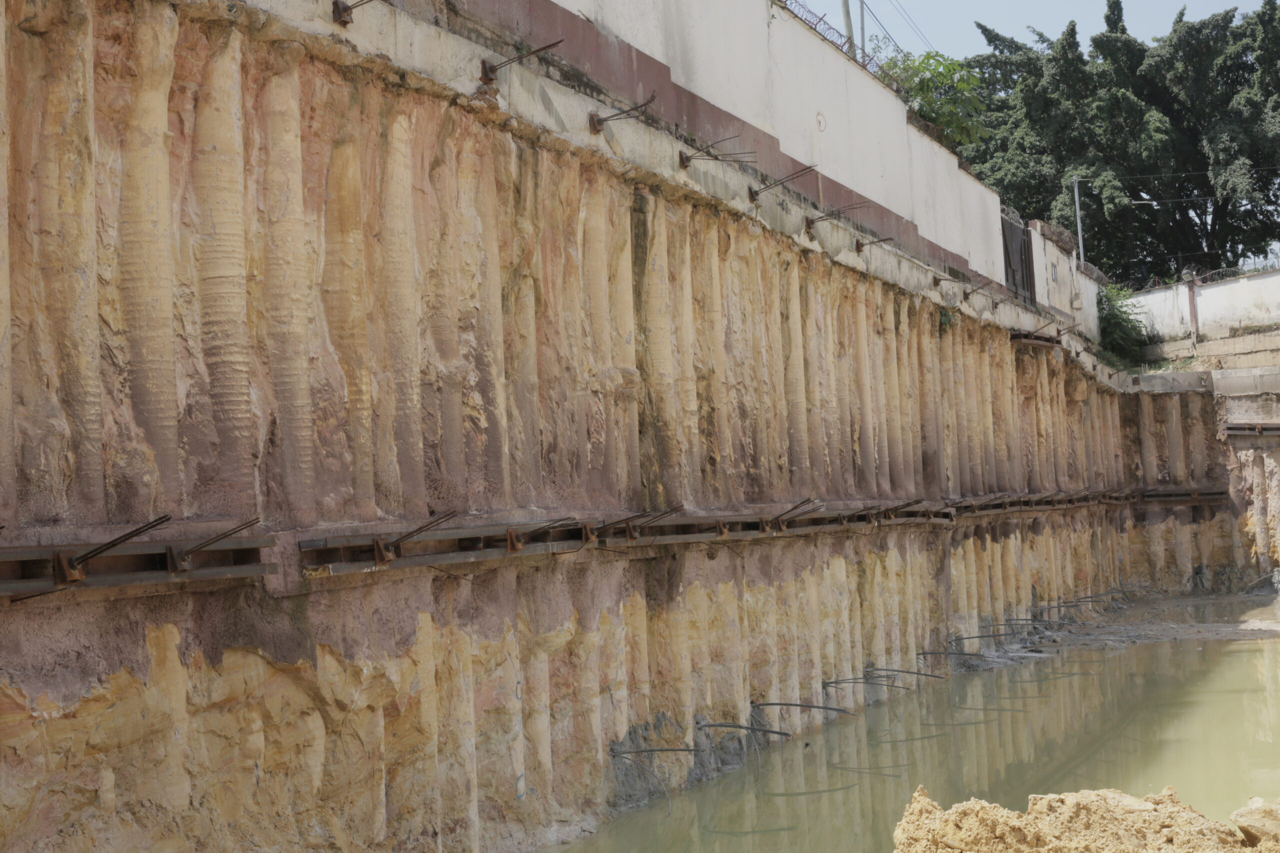 The adopted shoring and dewatering system balances soil behavior, water pressure, and structural requirements, creating a controlled environment for the continuation of excavation works.