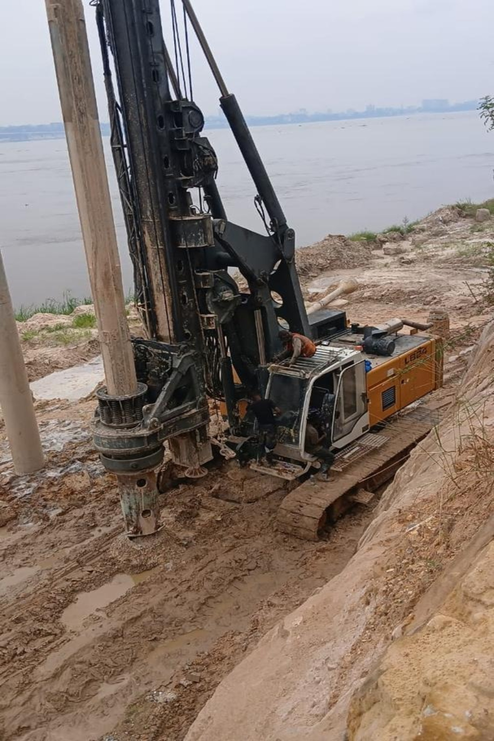 The subsurface consists of brownish soft sandy clay over dense yellowish sand — two layers with different compressibility and strength behavior. These conditions were carefully addressed through geotechnical design and controlled pile execution. A shallow groundwater table, influenced by the nearby river, was also considered to maintain stability during construction.